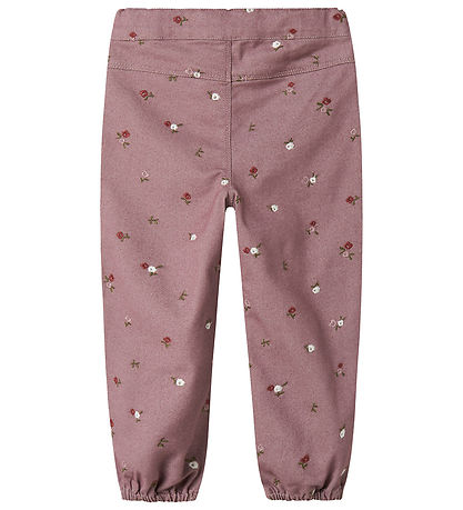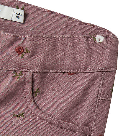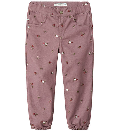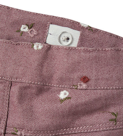 Magnifique pantalon Name It dans une couleur violet cendré avec de belles fleurs brodées en bordeaux, blanc et violet partout qui ajoutent une touche ludique.