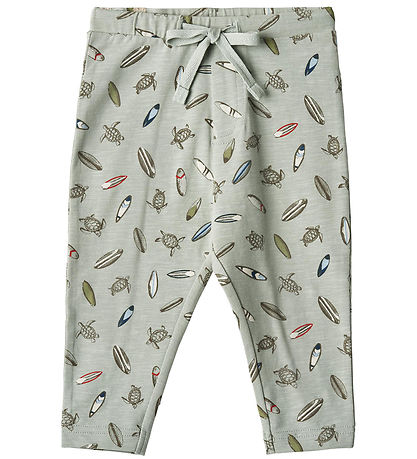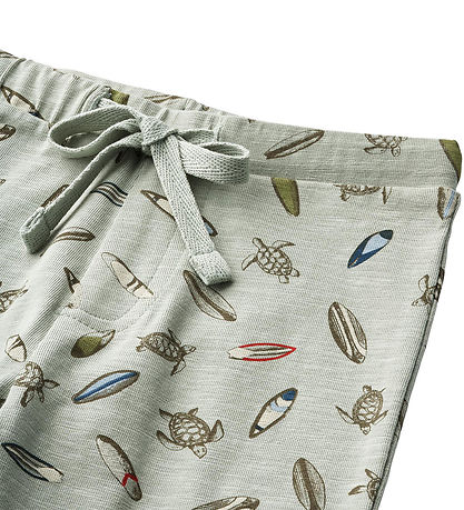 Pantalon Smart Wheat bleu avec un imprimé complet de tortues et de planches de surf en gris, bleu, vert et rouge.