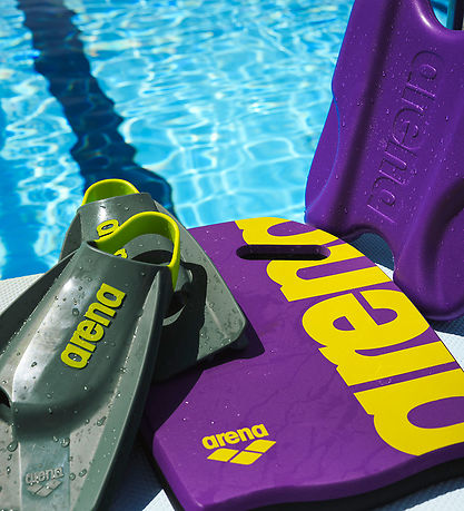 planche de natation Smart Arena en violet et citron vert avec logos.