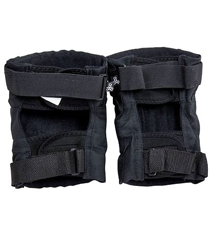Jolies protège-genoux Triple Eight en noir avec un logo Triple Eight en rouge et blanc sur le devant.
