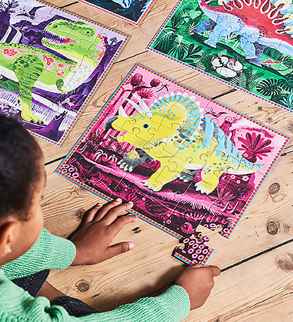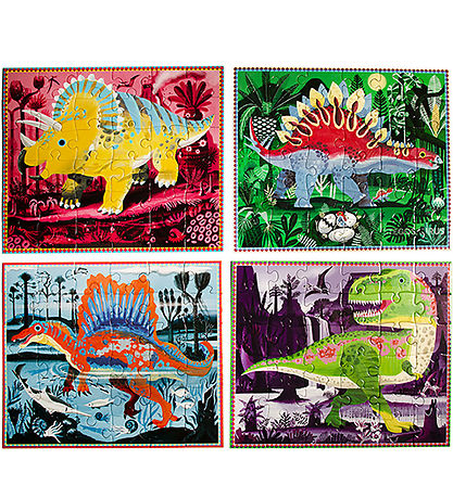 De fins puzzle Eeboo avec des motifs de dinosaures en couleurs, qui brillent dans le noir et montrent les os des dinosaures.