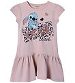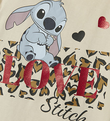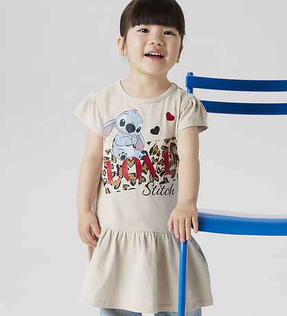 Jolie robe beige Name It ornée d'un grand imprimé du personnage Disney Stitch sur le devant, avec un imprimé léopard, des cœurs et l'inscription «Love Stitch». La Robe possède une encolure tour et des manches courtes froncées aux épaules. Elle est coupée à la taille, où de fines fronces créent une jupe fluide.