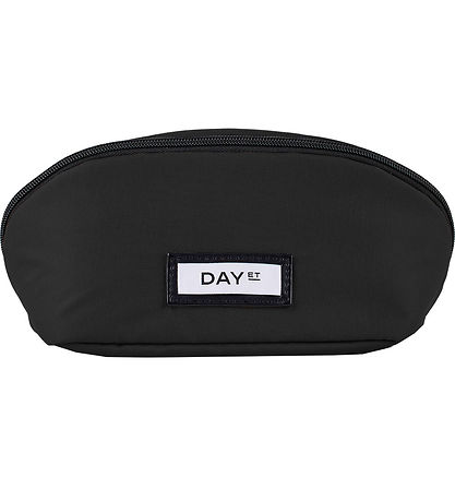 Belle trousse de toilette DAY ET de couleur noire avec une application sur le devant en faux cuir cuir noir et une étiquette en tissu blanc avec logo.