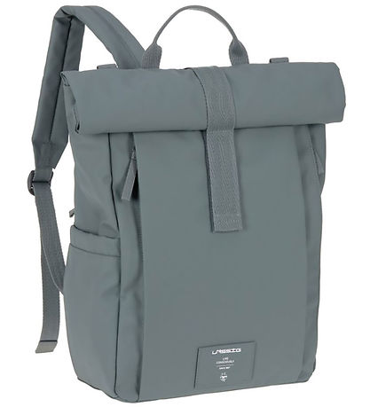 Le sac à langer Lässig se distingue par sa conception comme un sac à dos, doté de bretelles rembourrées et réglables et d'un dos en mesh légèrement rembourré pour plus de respirabilité. Une large sangle traverse le dos pour un rangement externe. Il y a également une poignée de transport en haut et deux anneaux pour que le sac à langer puisse être monté sur un landau ou une poussette en combinaison avec les mousquetons fournis avec bandes velcro.