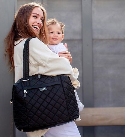 sac à langer pratique Storksak de noir, avec une surface matelassé et de beaux détails en métal doré.