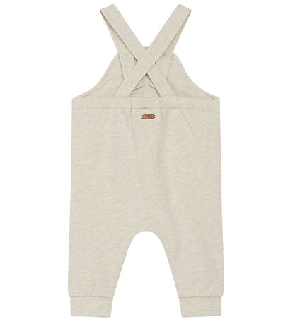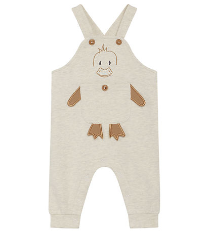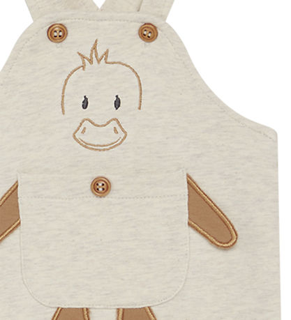 salopette fins Hust and Claire de couleur beige chiné avec une tête de canard brodée sur le devant, ainsi qu'une poche avec bras et pieds en 3D.