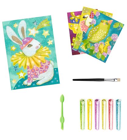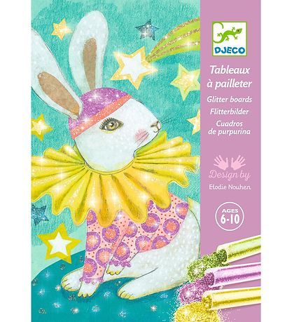 Le Djeco offre l'enfant la possibilité de décorer des images avec une pincée de glitter. L'enfant doit retrouver les zones collées sur les 4 images d'animaux, puis y déposer les paillettes selon le code couleur indiqué dans le livret. L'enfant doit utiliser l'outil en plastique pour retirer le papier de protection et retrouver les zones collées.