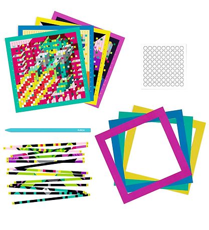 Le Djeco se compose de 4 assiettes aux motifs différents. L'enfant doit pousser les bandes de papier fournies sur les dessins partiellement imprimés. Petit à petit, une image apparaîtra sur l'assiette. Quatre cadres de couleurs différentes sont inclus, afin que les images puissent être encadrées une fois terminées.