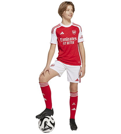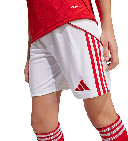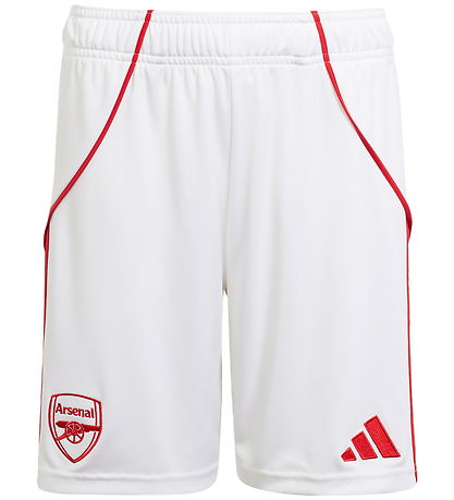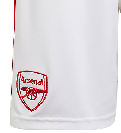 Short adidas Performance élégant en blanc avec des détails rouges et les a rayures adidas classiques sur les côtés. Le shorts adidas Performance est décoré d'un logo Arsenal sur une jambe et du adidas sur le côté opposé.