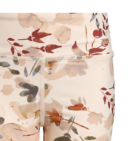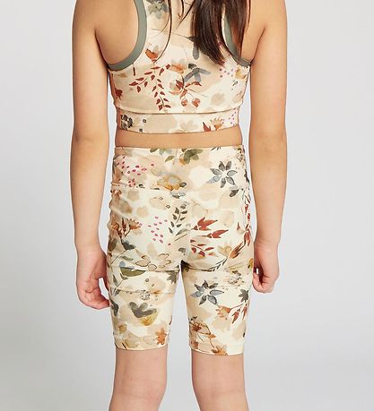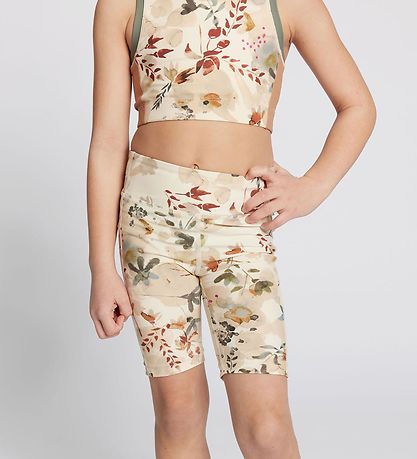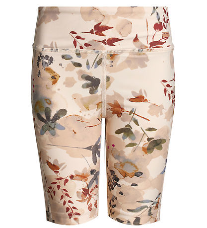 shorts de vélo fin Rethinkit en crème avec un imprimé floral imprimés en beige et avec des détails en bleu, marron et violet. Le cuissard est fabriqué dans une qualité sportive.