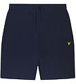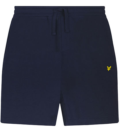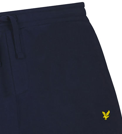 shorts en molleton intelligent Lyle & Scott bleu marine avec le logo de la marque brodé en noir et jaune sur la jambe gauche du pantalon.
