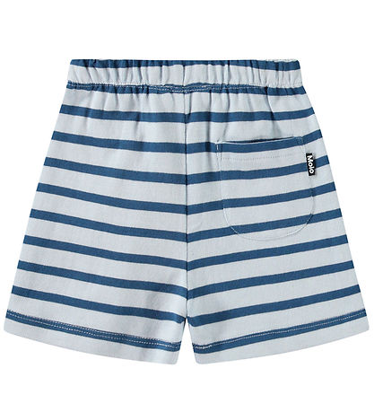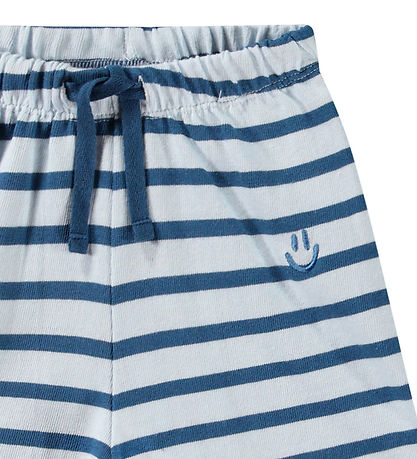 Joli short Molo au joli motif bleu à rayures et avec un smiley bleu brodé sur la jambe gauche. À l'arrière, il y a une poche ouverte sur le côté droit.