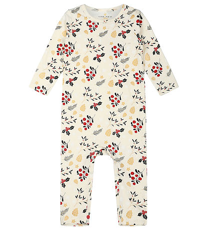 Magnifique grenouillère The New Siblings de couleur crème avec un imprimé de Noël avec des baies rouges, des fesses vertes, des flocons de neige blancs et des détails dorés.