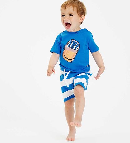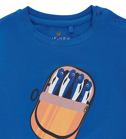Joli t-shirt The New Siblings en bleu avec un grand imprimé d'une boîte de poisson.