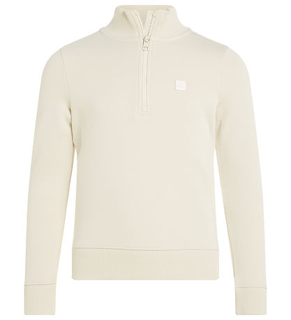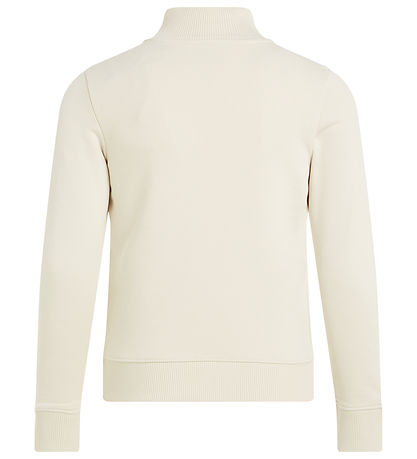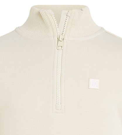 Joli sweat Calvin Klein à manches longues dans une teinte beige clair, avec un zip pratique au niveau du cou et un logo discret sur le devant.