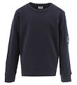 Élégant sweat-shirt CP Company noir, orné d'un imprimé vertical blanc unique du nom de la marque et d'un personnage stylisé. Doté de manches longues et tour, ce sweat-shirt CP Company affiche un design épuré et simple.