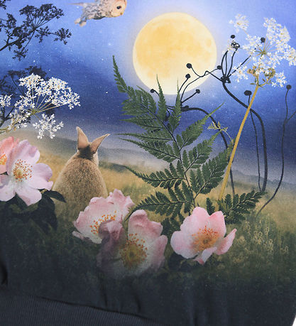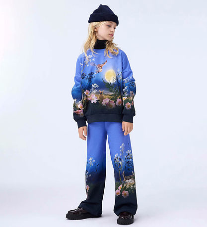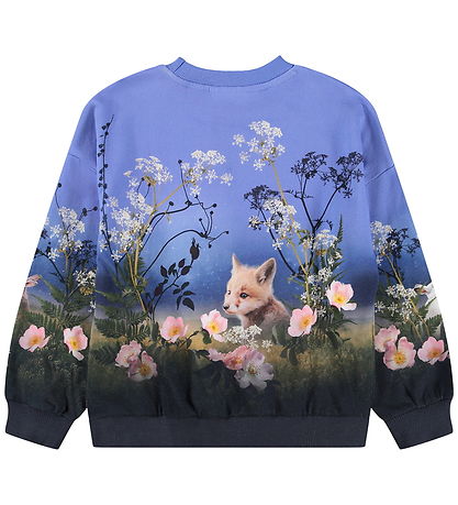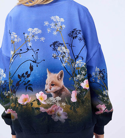 Sweat-shirt Smart Molo bleu, devenant progressivement plus foncé. Il arbore un motif nature coloré, composé de fleurs et d'adorables animaux. Il possède une encolure tour et des manches longues bords côtelés côtes. L'intérieur est en coton brossé doux.