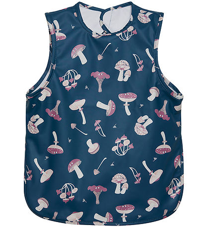 Magnifique tablier CeLaVi en PU pétrole avec un imprimé de différents champignons en rose foncé et crème.