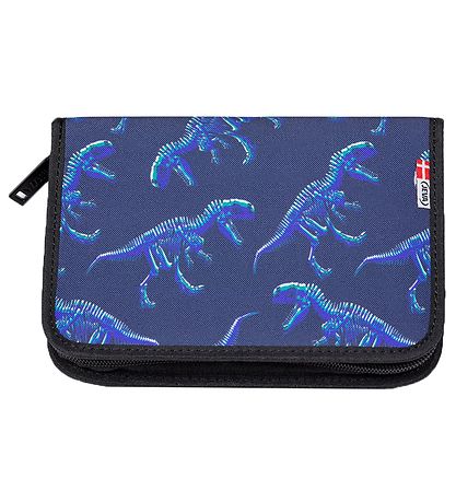 trousse Jeva cool en bleu avec un imprimé intégral de squelettes de dinosaur dans des tons de vert et de bleu.