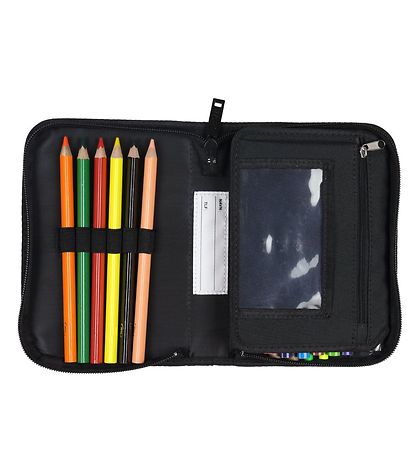La Trousse s'ouvre avec une fermeture éclair et se compose d'un grand compartiment divisé par un rabat fonctionnel. Le compartiment est doté d'une étiquette nominative et de nombreuses sangles élastiques pour garder une trace des instruments d'écriture. Le rabat est doté d'une poche zippée et d'une poche en filet noir pour le formulaire scolaire sur un côté.