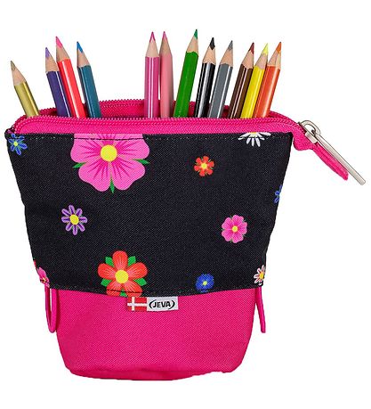 La trousse Jeva s'ouvre avec le zip en haut, la partie supérieure peut être tirée vers le bas à l'aide des deux sangles latérales pour que le contenu sorte et soit facilement accessible. À l'intérieur, la trousse comporte un grand compartiment et quatre petites poches plaquées.