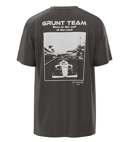 T-shirt Cool Grunt en gris, avec un imprimé sur le dos d'une voiture de course et le texte "Grunt Team, Race to the end of the road" en marron clair.