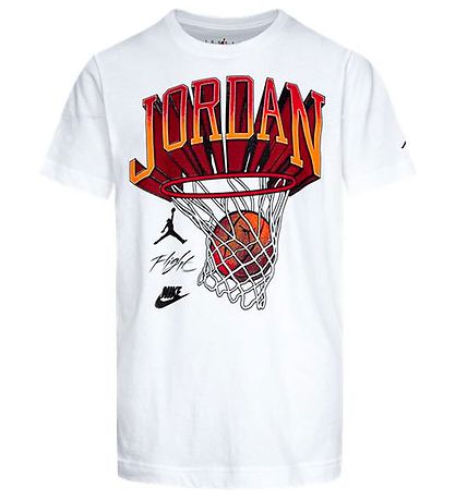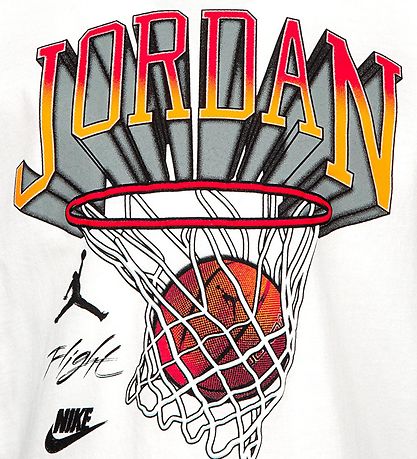 t-shirt Jordan cool en blanc, et sur le devant il est écrit "Jordan" en grosses lettre en rouge, orange et gris, et en dessous il y a un panier de basket.