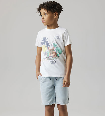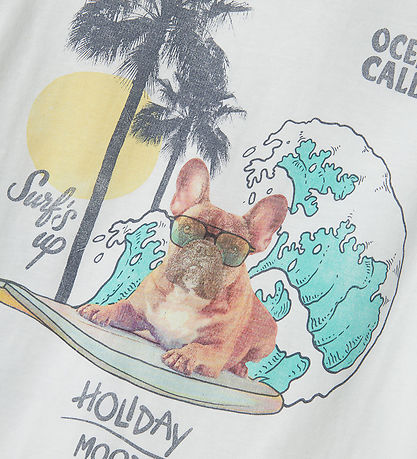 Charmant t-shirt Name It en blanc avec un imprimé estival d'un chien sur une planche de surf, entouré de palmiers et de vagues. Des textes comme « Surf's up » et «Holiday Mood » soulignent le thème du t-shirt.
