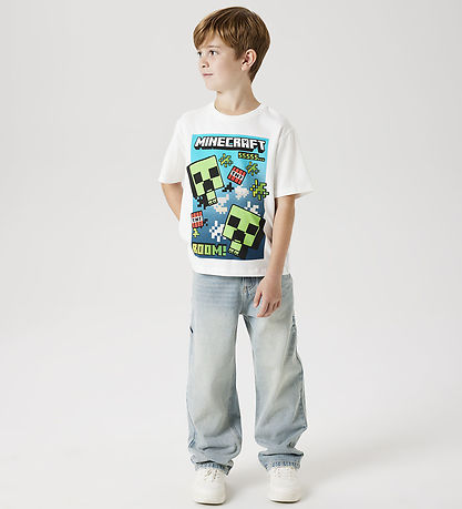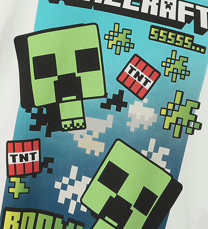 T-shirt Fresh Name It en blanc avec un imprimé Minecraft amusant montrant des caractères et des éléments TNT. Le T-shirt a des manches courtes et un design accrocheur, parfait pour les fans du jeu.