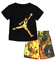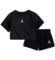 Adorable set Jordan, composé d'un t-shirt et d'un short de shorts en molleton de noir, et d'un logo blanc brodé sur le devant du t-shirt et sur le côté gauche du shorts.
