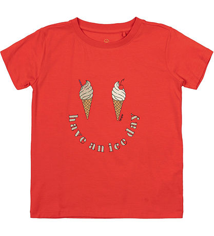 T-shirt frais de couleur rouge prêt avec un motif de glace amusant et le texte «Have an ice day » sur le devant. The New T-Shirt a des manches courtes et donne un look vivant à n'importe quelle garde-robe.