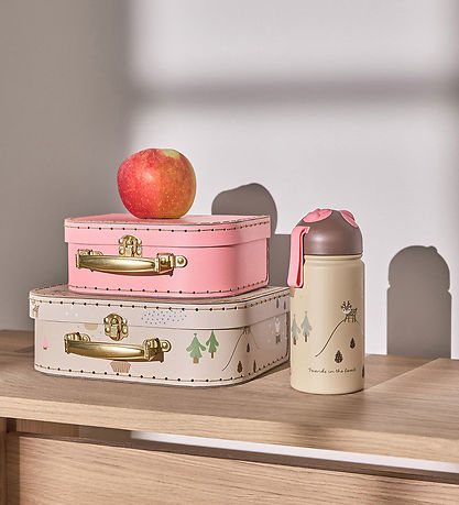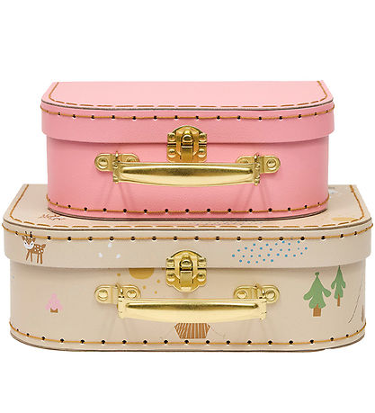 valise en carton OYOY amusant composé d'une grande et d'une petite valise en carton. Le grand est beige avec un joli imprimé de cerfs et de canards, et le petit est rose de couleur unie.
