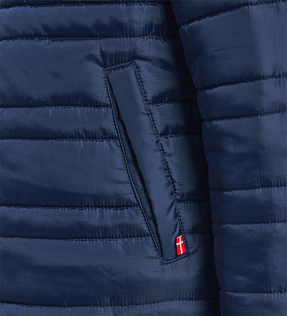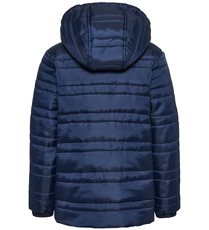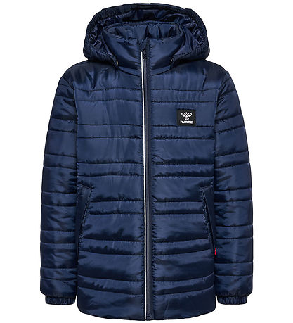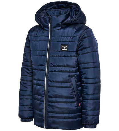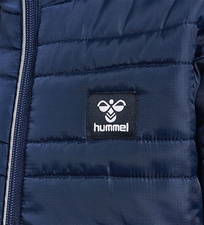 Jolie veste rembourrée Hummel bleu marine brillant avec surpiqûres horizontales avec patch logo noir et blanc.