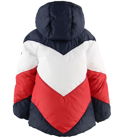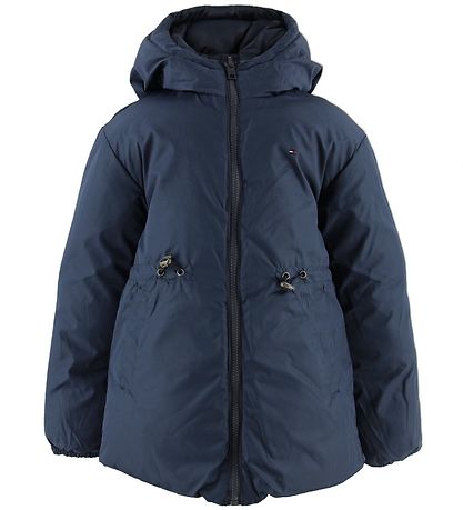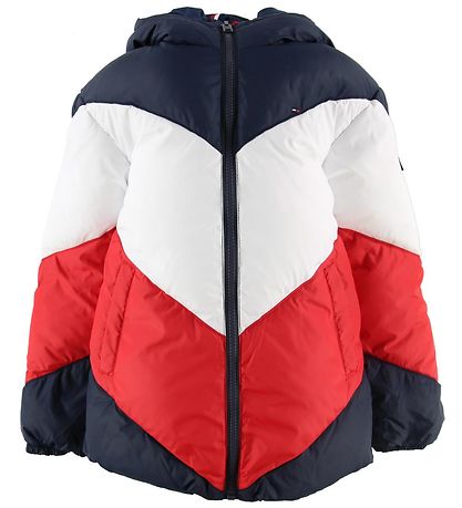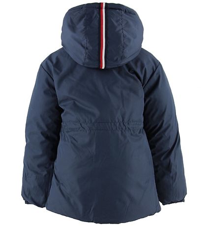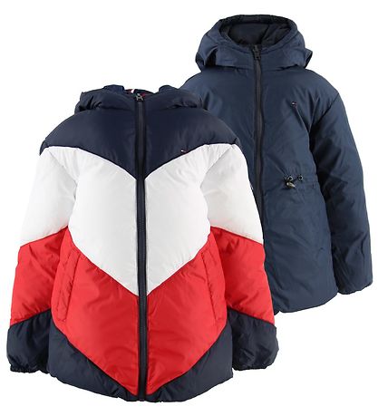 Jolie veste rembourrée Tommy Hilfiger au design smart et réversible. D'un côté, la veste est de couleur unie marine avec une bande sur la capuche en marine, blanc et rouge, ainsi qu'un logo Tommy Hilfiger sur la poitrine gauche. D'autre part, la veste est marine, rouge et blanc avec un logo Tommy Hilfiger sur la poitrine gauche et la manche.