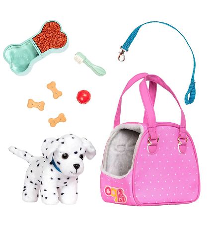 Le chien Our Generation est fabriqué dans une qualité douce et le chien est livré avec : un sac rose clair avec des c'urs blancs, une laisse et un collier pour chien en bleu, trois friandises pour chien, une balle, une brosse à dents, un bol de nourriture et un bol d'eau.