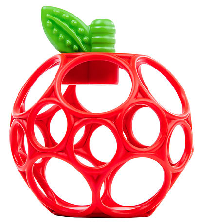 anneau de dentition Fun Oball en forme de pomme rouge dans une structure creuse avec grille et avec une feuille verte sur le dessus, qui est un rabat à mordre.