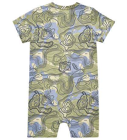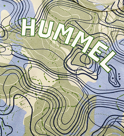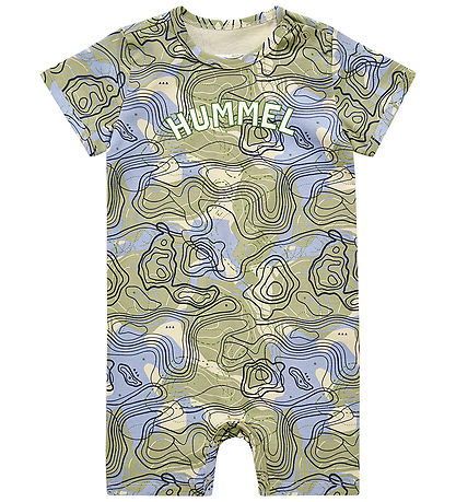 Magnifique barboteuse d'été Hummel en vert cendré avec un imprimé complet en bleu, bleu marine et blanc cassé. Sur le devant, le nom de la marque est inscrit en blanc.