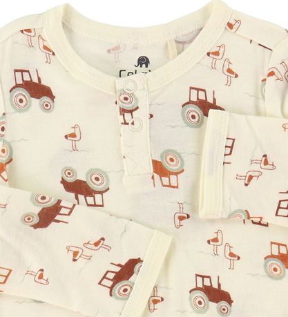 Magnifique blouse CeLaVi blanc avec un imprimé complet de tracteurs marron.