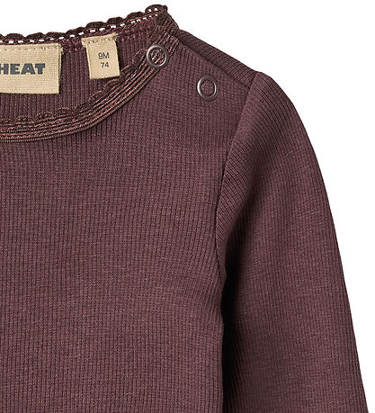 Magnifique blouse Wheat violet foncé à la structure côtelée. Chemisier présente une encolure tour bordée d'une fine dentelle et À boutons poussoirs sur l'épaule gauche. Ses manches longues sont ornées de bords ondulés à l'ouverture des manches et de la taille. Chemisier est confectionné dans un doux mélange de coton biologique et de modal.