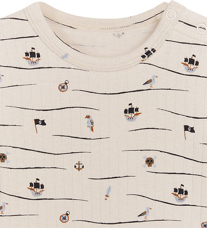 Délicieux body Hust and Claire à manches courtes de couleur beige clair, orné d'un fin imprimé de navires, drapeaux et étoiles de mer. Le body est doté À boutons poussoirs sur l'épaule gauche, ce qui le rend parfait pour une journée confortable.