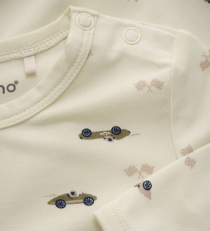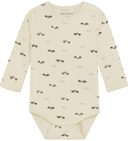 Magnifique body Minymo de couleur crème, orné d'un joli imprimé de voiture de course dans les tons beige et vert olive. Le body est doté de boutons à l'épaule pour faciliter l'habillage et le déshabillage. Parfait pour les plus petits.
