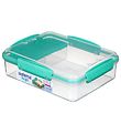 La boîte à repas Sistema est dotée d'un couvercle smart qui se ferme de tous les côtés avec des clips spéciaux. À l'intérieur, la boîte à repas comporte en haut un plateau amovible, divisé en diagonale en quatre compartiments, et au milieu il y a de la place pour le petit récipient supplémentaire. De l'autre côté du plateau, les couverts sont encliquetés. Sous le plateau, la boîte à repas dispose d'une grande pièce avec beaucoup d'espace pour par ex. une salade, tandis que les accompagnements et la vinaigrette peuvent être dans le plateau et le récipient supplémentaire associé.