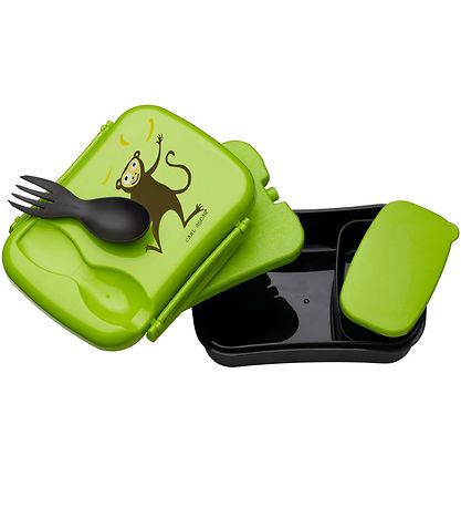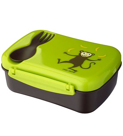 boîte à repas pratique Carl Oscar en noir et avec un couvercle vert citron avec un singe marron jonglant avec des bananes jaunes.