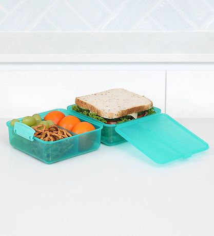 La boîte à repas Sistema est équipée de manière pratique d'une set supérieure composée d'un grand compartiment et d'une set inférieure composée de deux compartiments séparés. Le fond de la set supérieure peut être ouvert et sert en même temps de cloison entre les deux parties de la lunch box. La Boîte à repas dans son ensemble se ferme avec un clip spécial sur le côté.
