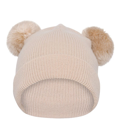 bonnet Sweet MP de couleur blanc de couleur unie avec deux pompons doux sur le dessus en faux cuir fourrure, qui donne un look ludique et amusant.