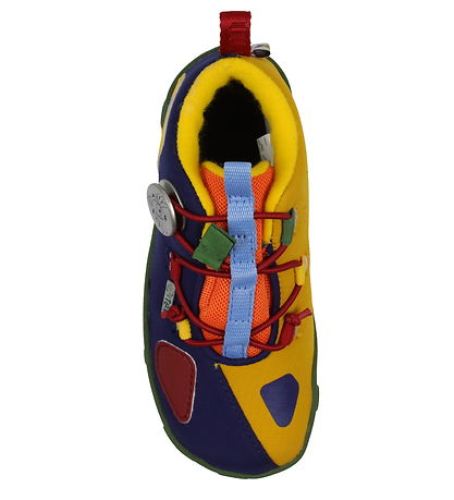 Bottines Affenzahn pratiques en textile bleu foncé et jaune moutarde avec détails bleu clair, orange, rouge et vert. Les Bottes portent un logo Affenzahn à l'extérieur et un oiseau sur le mécanisme de fermeture à l'extérieur.