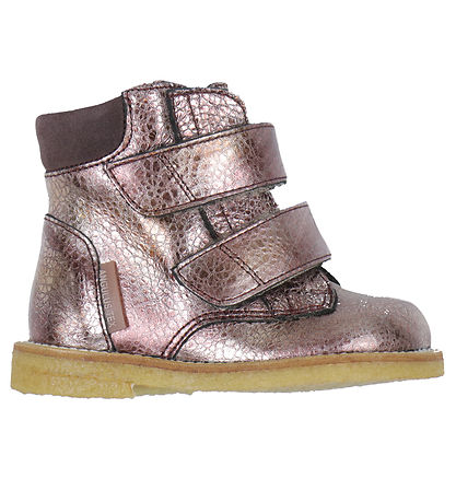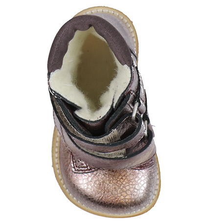 Belles bottines d'apprentissage à la marche Angulus pour débutants en cuir métallisé, violet et daim violet autour de l'ouverture.