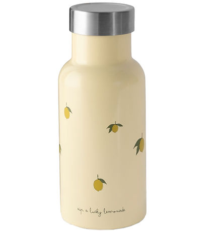 Belle bouteille thermos Konges Sløjd de couleur beige avec un imprimé de citrons. La Bouteille thermos a une capacité de 350 ml.