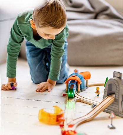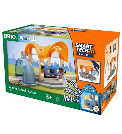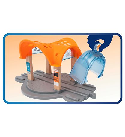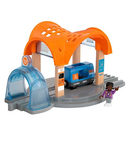 Gare BRIO Smart orange, bleu et gris. Comprend un Tunnel Smart Tech avec des effets sonores et lumineux captivants au passage du train.