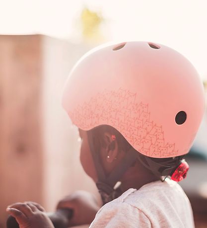 Joli casque de vélo Scoot and Ride dans une teinte rose avec un joli imprimé de chats et de réflecteurs sur les côtés et des sangles noir.